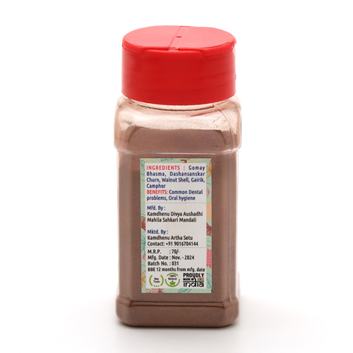 Shree Kamdhenu Divya Aushadhi Mahila Shakari Mandali Jamnagar, Gujarat.Product Name Dantayu Product Dimension - Individual 8.5cm x 9cm x 10.5cm Product Dimension - Bulk 13cm x 25cm x 19cm Product weight - Individual 165gm Product weight – Bulk 1885gm Brand Name Gosetu Net Quantity 60gm Best Before 24 months Marketer Details Kamdhenu Artha Setu Jamnagar, Gujarat. Manufacturers Details