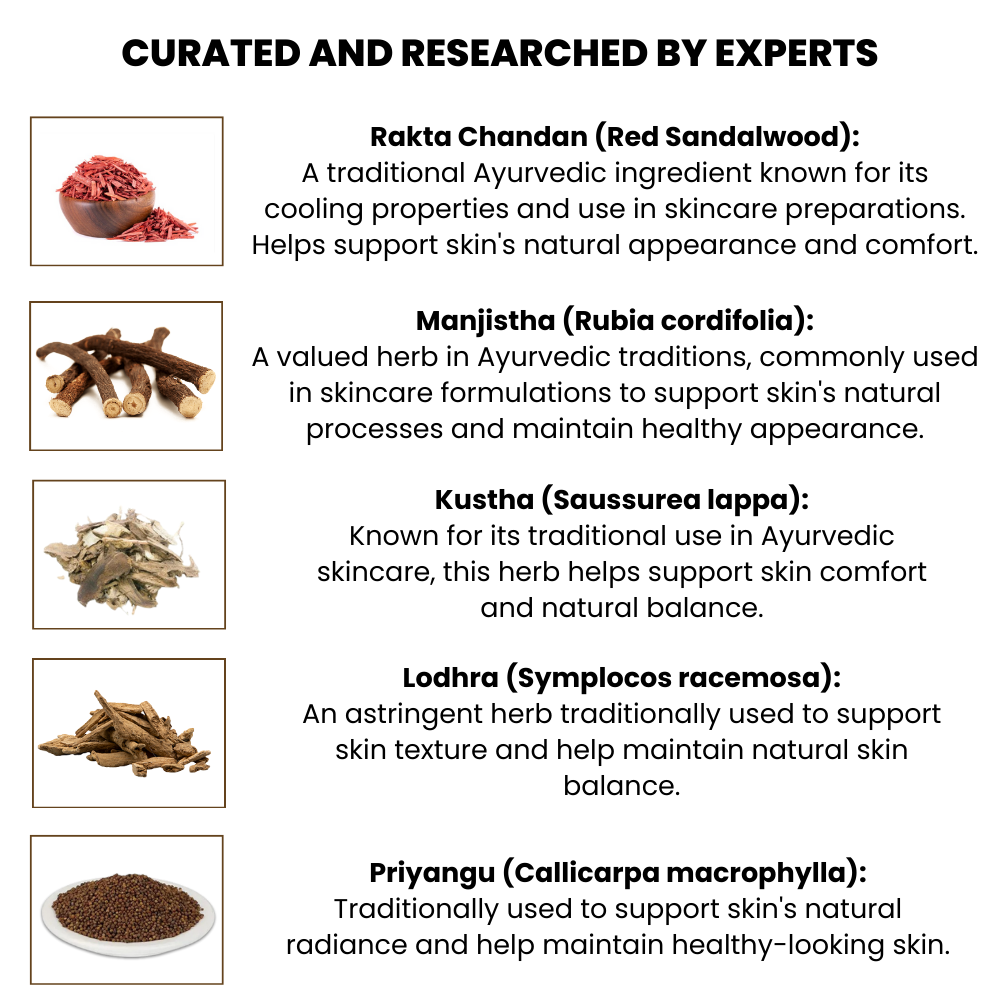 Contains Rakta Chandan (Pterocarpus santalinus, Ht.Wd.) 14.3 g, Manjistha (Rubia cordifolia, Rt.) 14.3 g, Lodhra (Symplocos racemosa, Bk.) 14.3 g, Kushta (Saussurea costus, Rt.) 14.3 g, Priyangu (Callicarpa macrophylla, Fl.) 14.3 g, Vata Praroha (Ficus benghalensis, Pr.Rt.) 14.3 g, and Masura (Lens culinaris, Sd.) 14.3 g