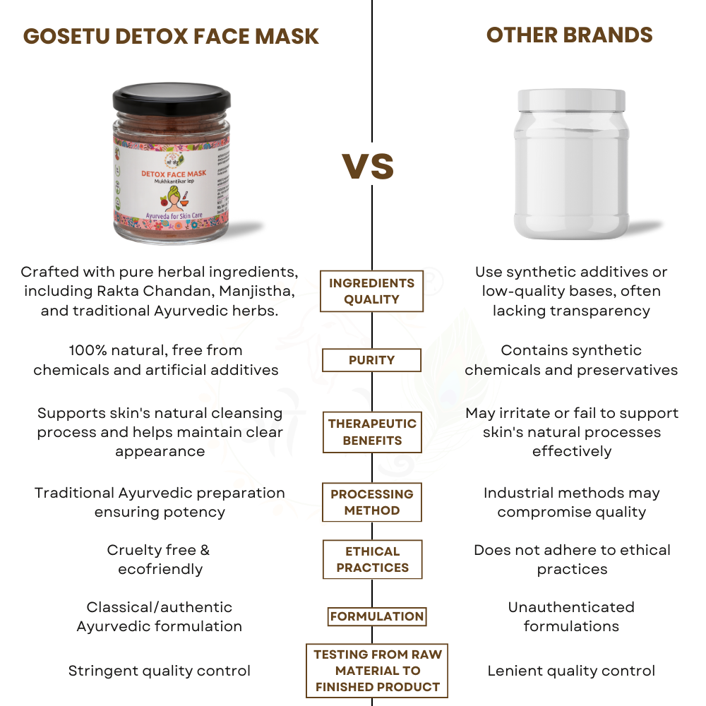 Shree Kamdhenu Divya Aushadhi Mahila Shakari Mandali Jamnagar, Gujarat.Product Name DETOX FACE MASK Product Dimension - Individual 8.5cm x 9cm x 10.5cm Product Dimension - Bulk 13cm x 25cm x 13cm Product weight - Individual 340gm Product weight – Bulk 1700gm Brand Name Gosetu Net Quantity 100gm Best Before 24 months Marketer Details Kamdhenu Artha Setu Jamnagar, Gujarat. Manufacturers Details