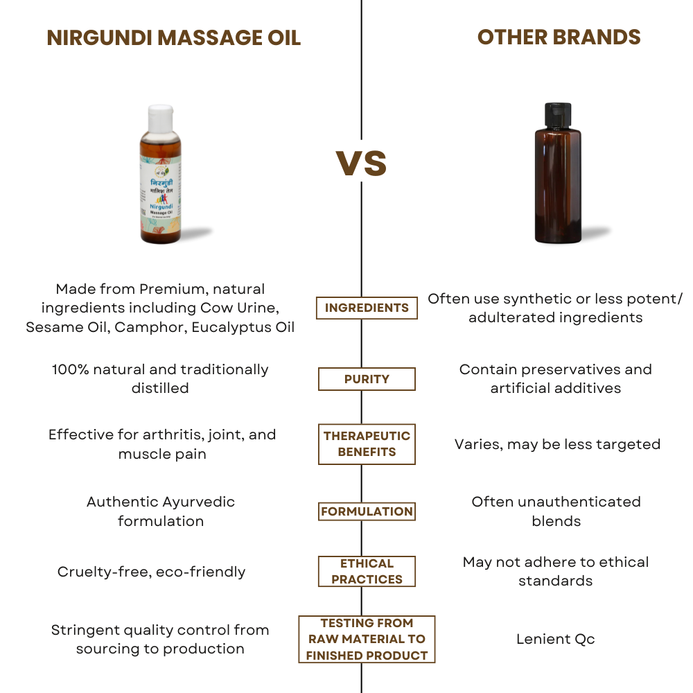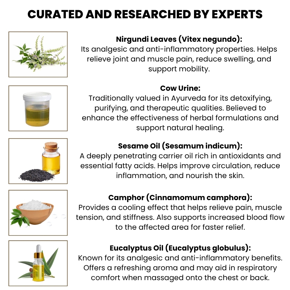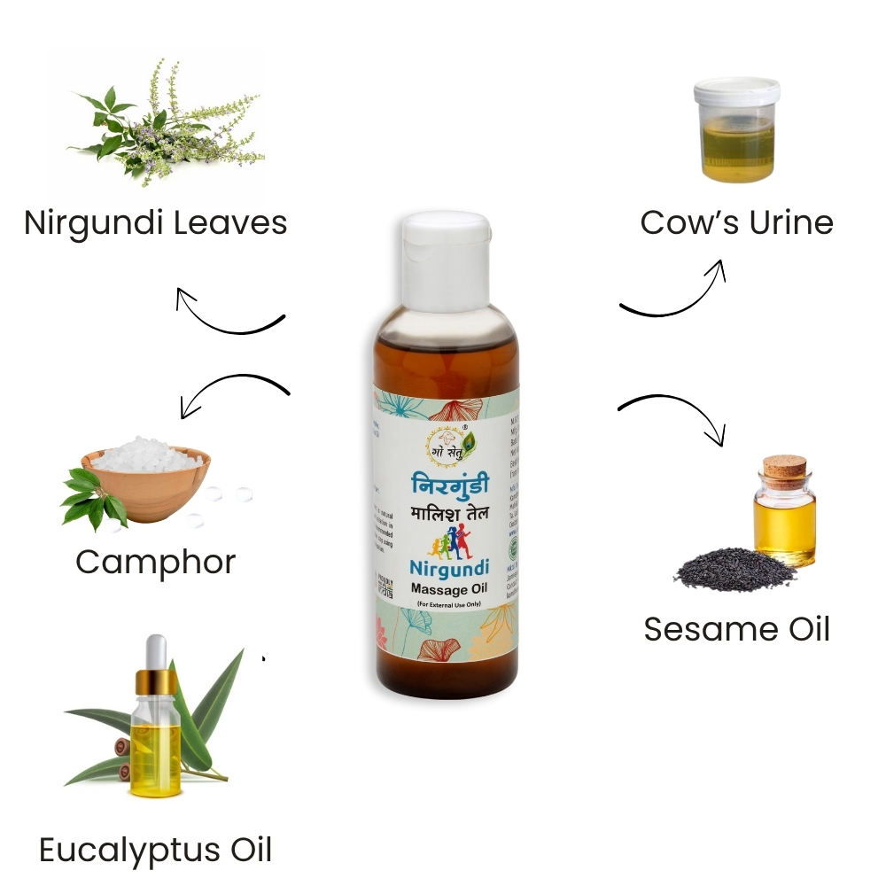 Nirgundi Massage Oil is a traditional Ayurvedic formulation crafted to provide effective, natural relief from joint pain, muscle stiffness, and arthritis. Made using indigenous cow’s urine, Nirgundi leaves, sesame oil, camphor, and eucalyptus oil.