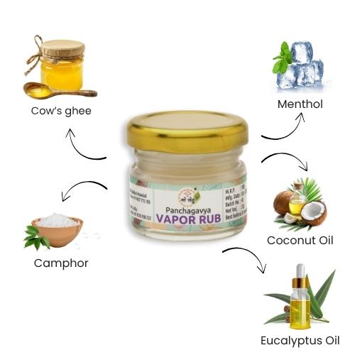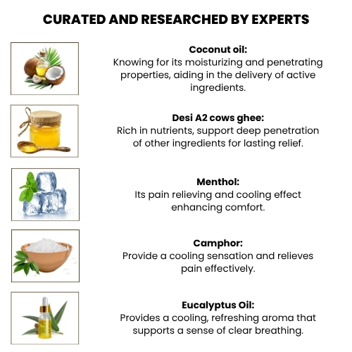 Gau Ghrita (Ghrita) – 0.74 g, Coconut Oil (Cocos nucifera, Ol.) – 14.65 g, Beeswax (Cera alba) – 6.74 g, Karpur (Cinnamomum camphora, Exud.) – 1.46 g, Ajwain (Trachyspermum ammi, Fr.) – 0.05 g, Menthol (Mentha arvensis, Cryst.) – 0.73 g, Nilgiri Oil (Eucalyptus globulus, Ol.) – 0.15 g, Jayphal Oil (Myristica fragrans, Ol.) – 0.49 g.