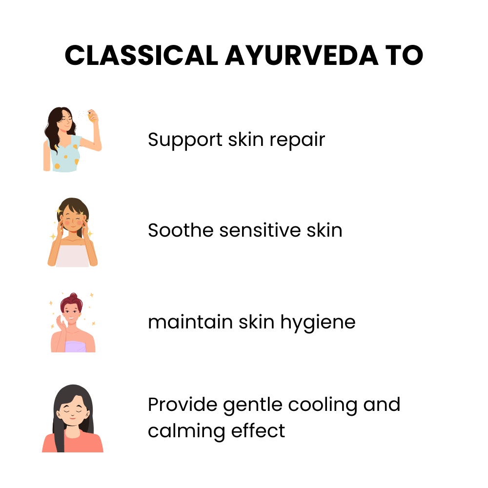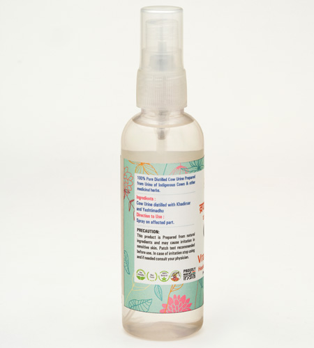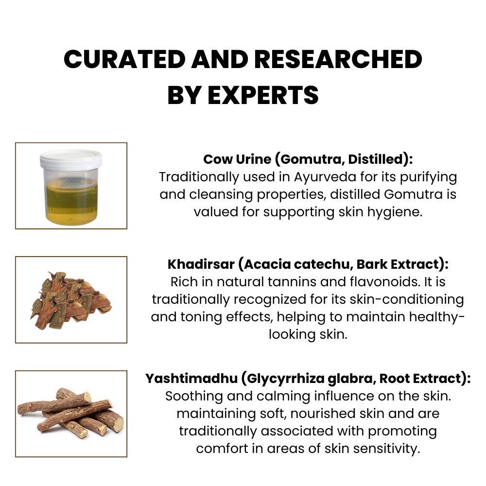 This Ayurvedic distillate is prepared using indigenous cow urine, Khadira (Acacia catechu) bark powder, and Yashtimadhu (Glycyrrhiza glabra) root powder through a traditional distillation process. It is intended for external application to help maintain skin hygiene and support the natural cleansing of the skin.