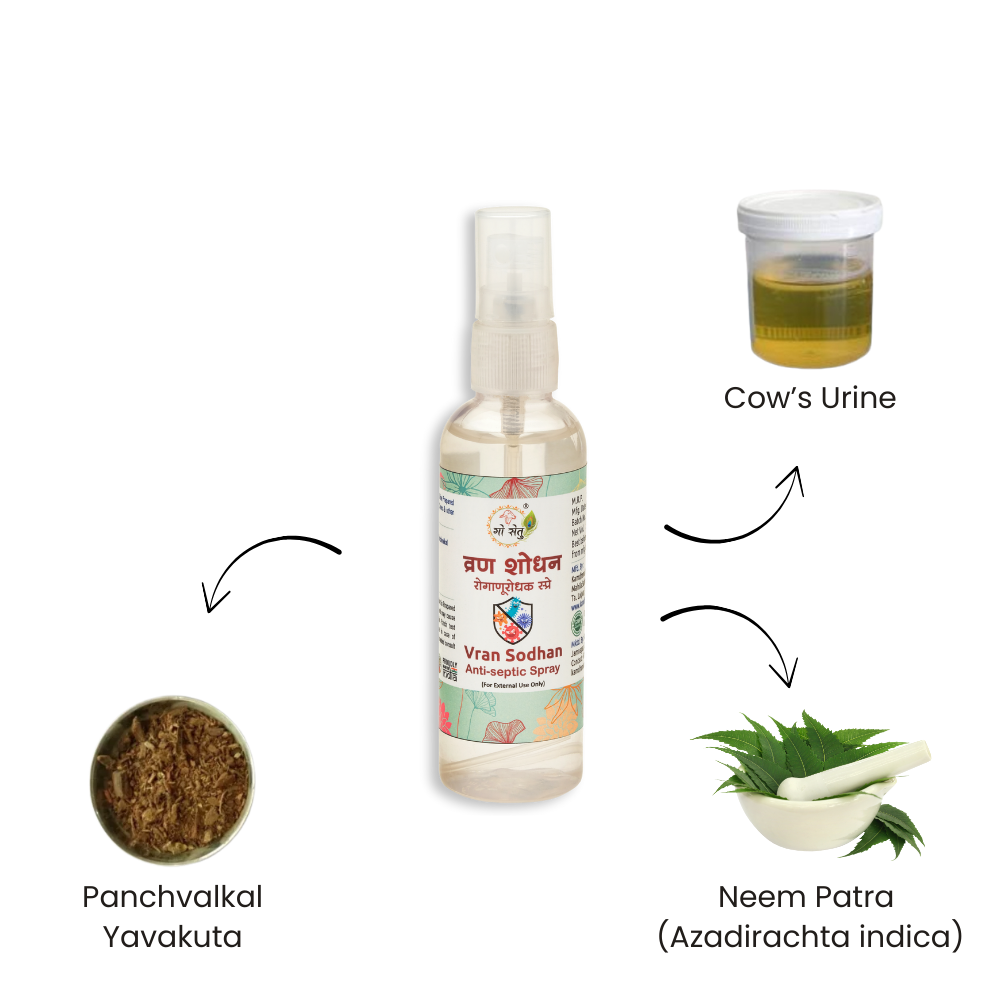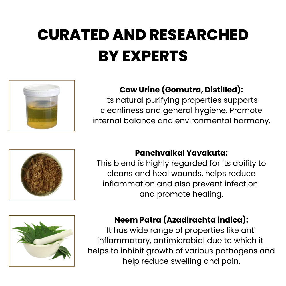 This herbal distillate is prepared using indigenous cow’s urine (Gomutra) along with traditionally known botanical ingredients like Panchvalkal Yavakuta and Neem leaves (Azadirachta indica). It is intended for external use as a natural cleansing spray to support hygiene and skin care. Suitable for application on minor skin discomforts and for general skin hygiene.